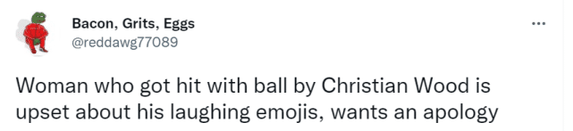 事后接受媒体采访时,这位女球迷表示:她更希望看到的是伍德的直接道歉。她表示,自己不喜欢伍德在社媒上添加的“笑哭表情符号”,认为他的回应不合时宜。她还透露,医生检查过她的面部伤势后,建议她在家休息三周,不要工作。
