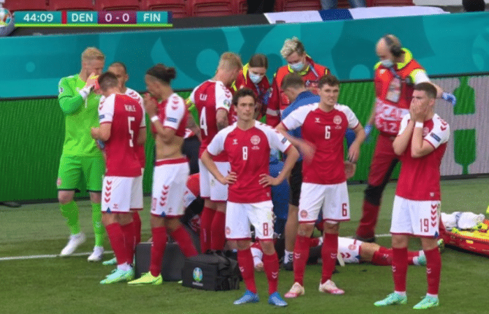 上半场的比赛进行到第42分钟的时候,埃里克森突然栽倒在地上,这一幕让人看得十分揪心,在没有任何身体对抗的情况下,他直接栽倒在地,场上的球员一看情况不对,第一时间呼叫场边的队医进入到场内,队医对埃里克森进行心肺复苏术治疗,而丹麦的球员也是围住了埃里克森,现场的很多球迷已经在哭泣,而镜头给到场边的时候埃里克森的妻子已经泣不成声,自己最亲的人突然倒下了,一切都是来得那么突然,没有任何的征兆,克亚尔、舒梅切尔不断的在安慰着她。随后担架车进入了场内,埃里克森被医疗人员抬出场,而丹麦队的球员也跟着离场了。