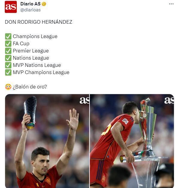 正因为此,赛后西班牙媒体《阿斯报》也为本国球员罗德里造势道:本赛季冠军拿到手软的罗德里能获得金球奖吗?