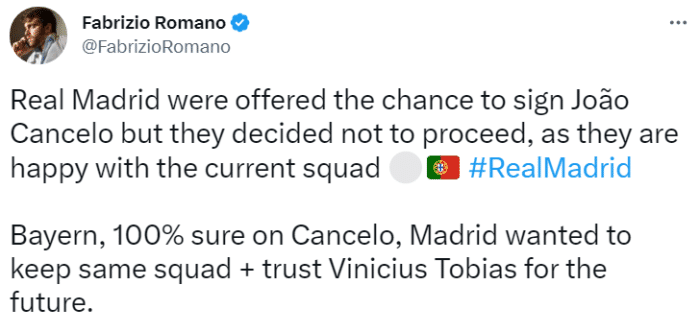 罗马诺表示,皇马本有机会签下坎塞洛,但他们没有选择跟进,因为他们对目前现有的阵容感到满意。