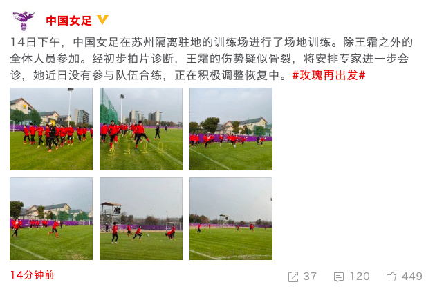 来源:360直播02-15 16:36360直播02月15日讯 ,中国女足官方发布消息,球队的核心王霜经初步拍片诊断,伤情为疑似骨裂,国家队将安排专家进一步会诊。目前,在苏州酒店隔离的中国女足全队已经重返隔离驻地的训练场进行训练,但王霜并没有参加,她正在积极调整恢复中。
