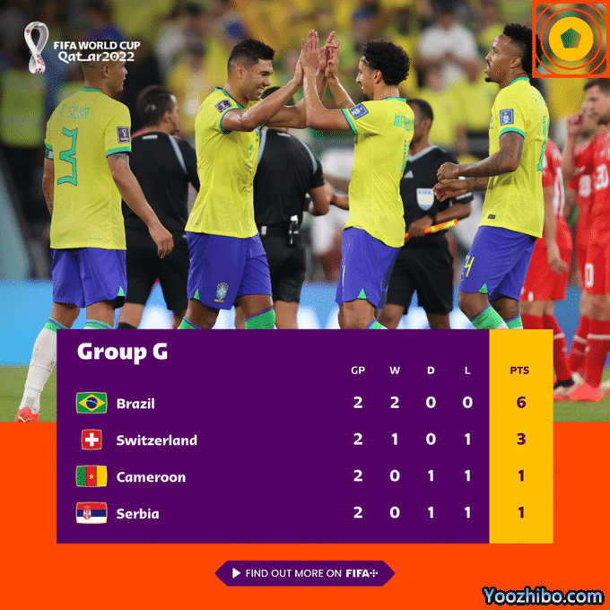 世界杯GH组积分榜:巴西、葡萄牙携手出线