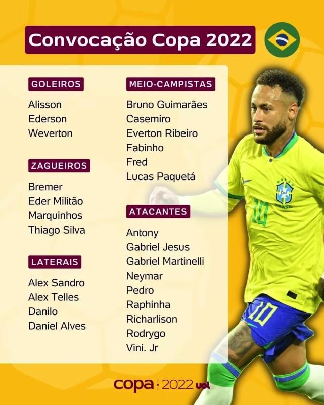 来源:360直播11-08 22:30360直播11月08日凌晨,巴西男足公布了2022年卡塔尔世界杯的26人参赛名单。内马尔、威尼休斯、热苏斯、卡塞米罗、马尔基尼奥、米利唐、蒂亚戈-席尔瓦、阿利松、埃德森等世界级球星,纷纷在列。