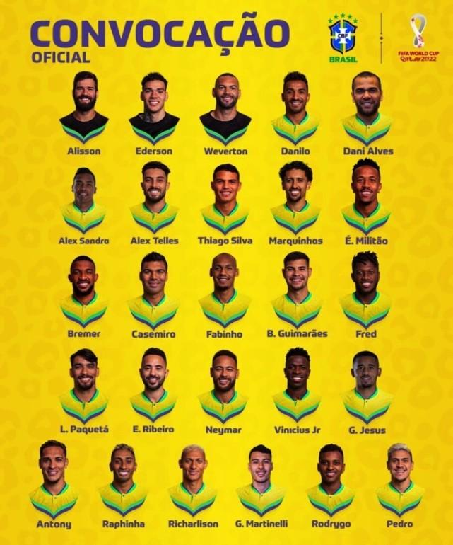 26人当中,有9人为前锋,8人为后卫,3人为门将,6人为中场。巴西这套阵容显然有些“头重脚轻”的感觉。其中7名都是首次参加世界杯,而只有9人参加过上届世界杯,分别是阿利松、埃德森、蒂亚戈-席尔瓦、马尔基尼奥斯、达尼洛、卡塞米罗、弗雷德、热苏斯、内马尔。