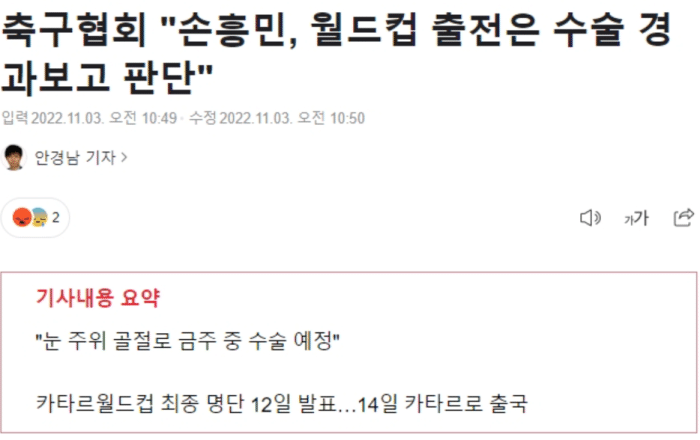 热刺官方今天表示,孙兴慜左眼附近骨折需要接受手术,而韩国足协随后发布公告称,他们与热刺俱乐部保持着沟通,将根据孙兴慜手术后的情况决定他是否能参加世界杯。