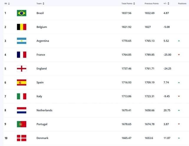 而世界排名前10的男足国家队则分别是巴西、比利时、阿根廷、法国、英格兰、西班牙、意大利、荷兰、葡萄牙、丹麦。相比于上期排名,阿根廷上升到第3,葡萄牙下跌至第9,而在欧国联比赛中表现出色的丹麦,则跻身前10位。