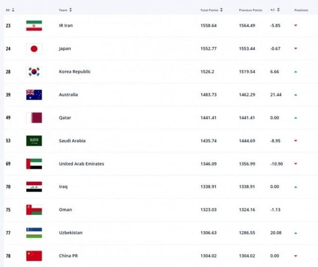 上期排名中,中国男足排在亚洲第10,世界第77位。而6月份没有参加任何国际比赛,这也让“原地踏步”的中国男足没有任何积分进账,总分依然为1304.02。而乌兹别克斯坦则拿到了20.08个积分。他们最新积分为1306.63。如此一来,乌兹别克斯坦也成功超越中国男足,来到亚洲第10位,中国男足则跌出了亚洲前10,排名亚洲第11、世界第78位。