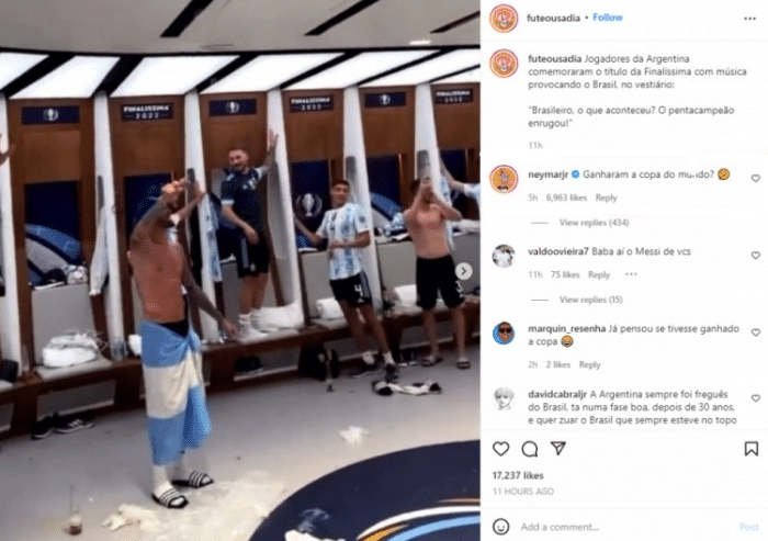 来源:360直播06-03 18:23360直播06月03日讯 昨天,阿根廷3-0大胜意大利夺得欧美杯冠军,赛后阿根廷全队在更衣室嘲讽巴西,对此内马尔作出了回应。