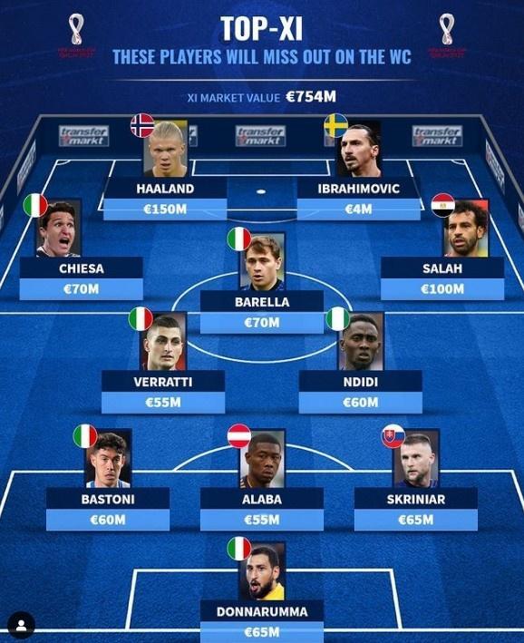 无缘世界杯最佳阵:萨拉赫哈兰德领衔,意大利6人