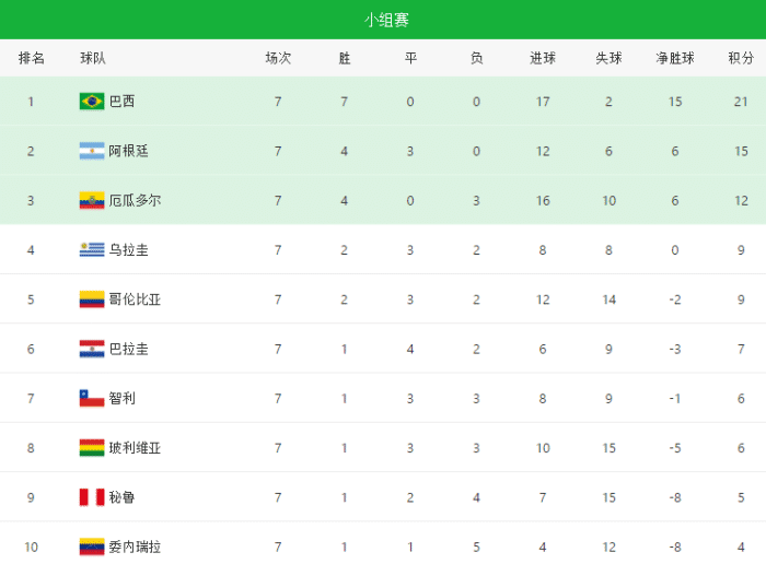 世预赛南美区积分榜!巴西7连胜领跑,阿根廷不败,最大黑马诞生