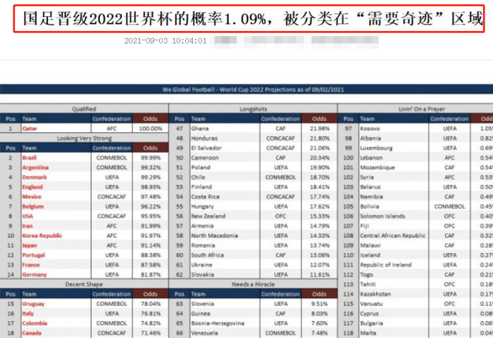 在国足输球之后,外媒也更新了国足打进世界杯的概率,只有1.09%,想要出线要发生奇迹了。而且,外网也重新定义了这支国足的前景,将国足分在“需要奇迹”才能打进世界杯的区域,可以说,亚洲区12强赛中,国足是最被看衰的球队之一。