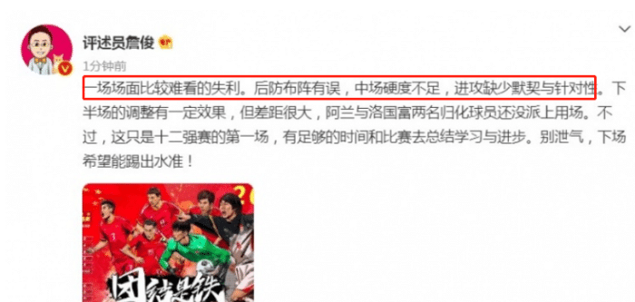足球评论员詹俊就在社媒上表示,“一场比较难看的失利。后防线有误,中场硬度不足,进攻缺少默契和针对性,下半场的调整有一定效果,但差距很大。阿兰和洛国富两名归化球员还没派上用场”。