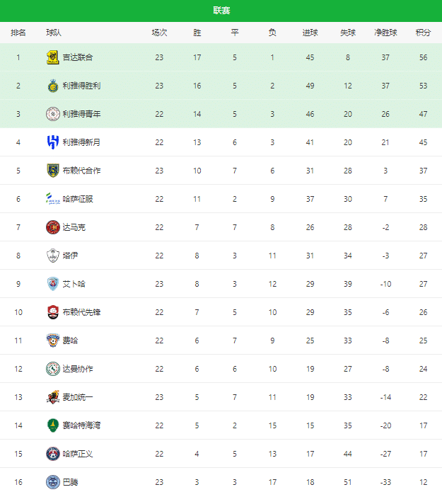 吉达联合强势领跑,他们此前1-0击败利雅得胜利,拿下冲冠路上的关键胜利,之后高歌猛进,稳居榜首。如今在击败麦加统一之后,吉达联合傲视群雄,他们已经领先身后的球队3分。沙特联赛一共30轮,目前吉达联合还剩下7轮的情况下积56分,夺冠的希望大增。