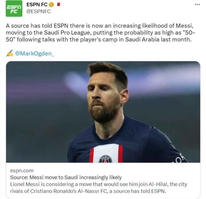 ESPN表示,早在去年年底利雅得新月俱乐部就曾与梅西的代表进行谈判,但当时这家沙特豪门签下梅西的可能性“微乎其微”。但4个月后情况却有了巨大转折。ESPN从接近双方谈判的消息人士得知,梅西现在越来越可能选择去沙特,上个月双方再次会谈后,目前的可能性是50对50。该消息人士负责访问沙特旅游活动,而梅西目前正是沙特旅游大使。