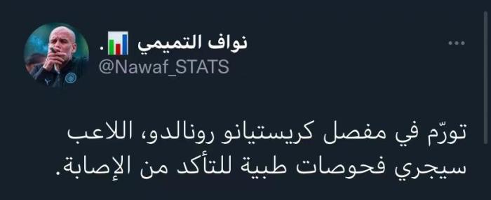 360直播01月27日讯 据沙特媒体人“Nawaf_Stats”报道,C罗在超级杯比赛中被铲伤,关节肿胀。