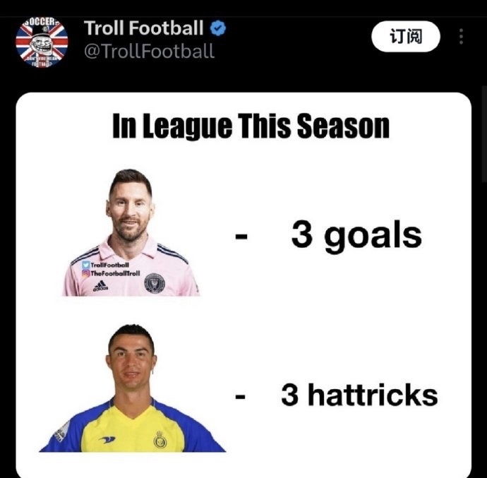 而在C罗此役独造5球后,拥有接近400万粉丝的知名账号“Troll Football”公开晒图嘲讽“绝代双骄”中的另外一位梅西。这位大V晒出了梅西和C罗的照片,并且带着嘲讽的语气说道:“有人本赛季已完成了三个帽子戏法,而有人则只进了3球!”这位大V还配上了4个“笑哭”的表情。