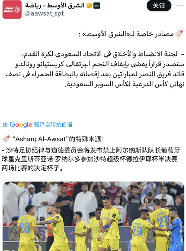沙特超级杯的半决赛,利雅得新月2-1击败利雅得胜利,这场比赛最后阶段,C罗肘击顶撞对手,引发冲突之后被出示红牌。C罗不满判罚,向纪律委员申诉,但很显然他的申诉没有被接受,如今根据沙特媒体《中东报》的报道显示,沙特足协纪律与道德委员会即将发布处罚结果,C罗为肘击付出代价,禁赛两场。