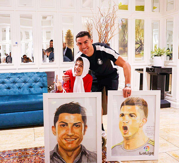 此前,在随利雅得胜利前往伊朗参加亚冠小组赛的比赛时,C罗遇到了一位名叫法蒂梅的残疾女画家。这名伊朗画家全身有85%的部分处于瘫痪状态,但她可以用脚画画,她还为C罗创作了肖像画。