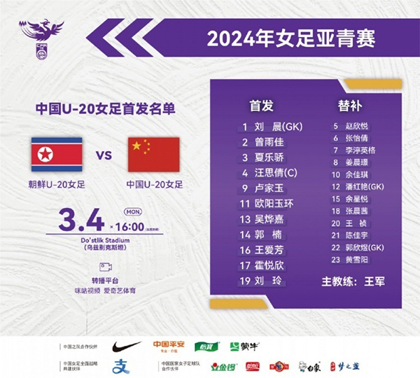 U20女足亚洲杯-中国VS朝鲜首发:刘晨、霍悦欣登场,欧阳玉环出战