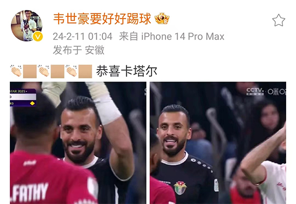 送出三个点球,助力卡塔尔完成卫冕,在这一场比赛结束后,国乒球员韦世豪也是在社交媒体上晒出了两张图片,配上了三个鼓掌的表情包和“恭喜卡塔尔”的话语。名记杜立言也是转发了韦世豪的动态并且询问球迷:“韦世豪这条,大家如何理解?”
