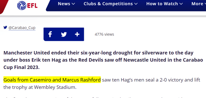 或许是为了成人之美,赛后EFL官方宣布,重新将进球算给拉什福德。在其官网对这场比赛的报道中,明确表示「卡塞米罗和拉什福德的进球帮助曼联取胜」。这么一来,拉什福德攻入了个人在联赛杯的第6粒进球,并有两次助攻,他也成为赛会最佳射手,超越了打入5球的南安普顿射手切·亚当斯,独占射手榜第一!