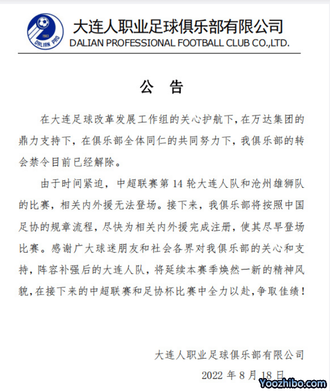 中超重启后,大连人在第一场比赛是1比1战平上海海港,拿到1分。如今,大连人又传出好消息。18日,大连人官方确认,球队的转会禁令解除,接下来球队会及时为外援办理注册手续。本赛季的夏季转会窗口是8月31日关闭,大连人还有接近两周的时间可以引援。