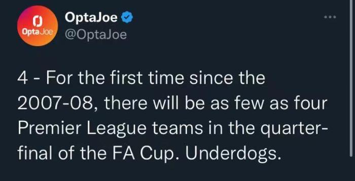 Opta表示,这是自2007-08赛季以来的首次,足总杯八强中只有4支英超球队。
